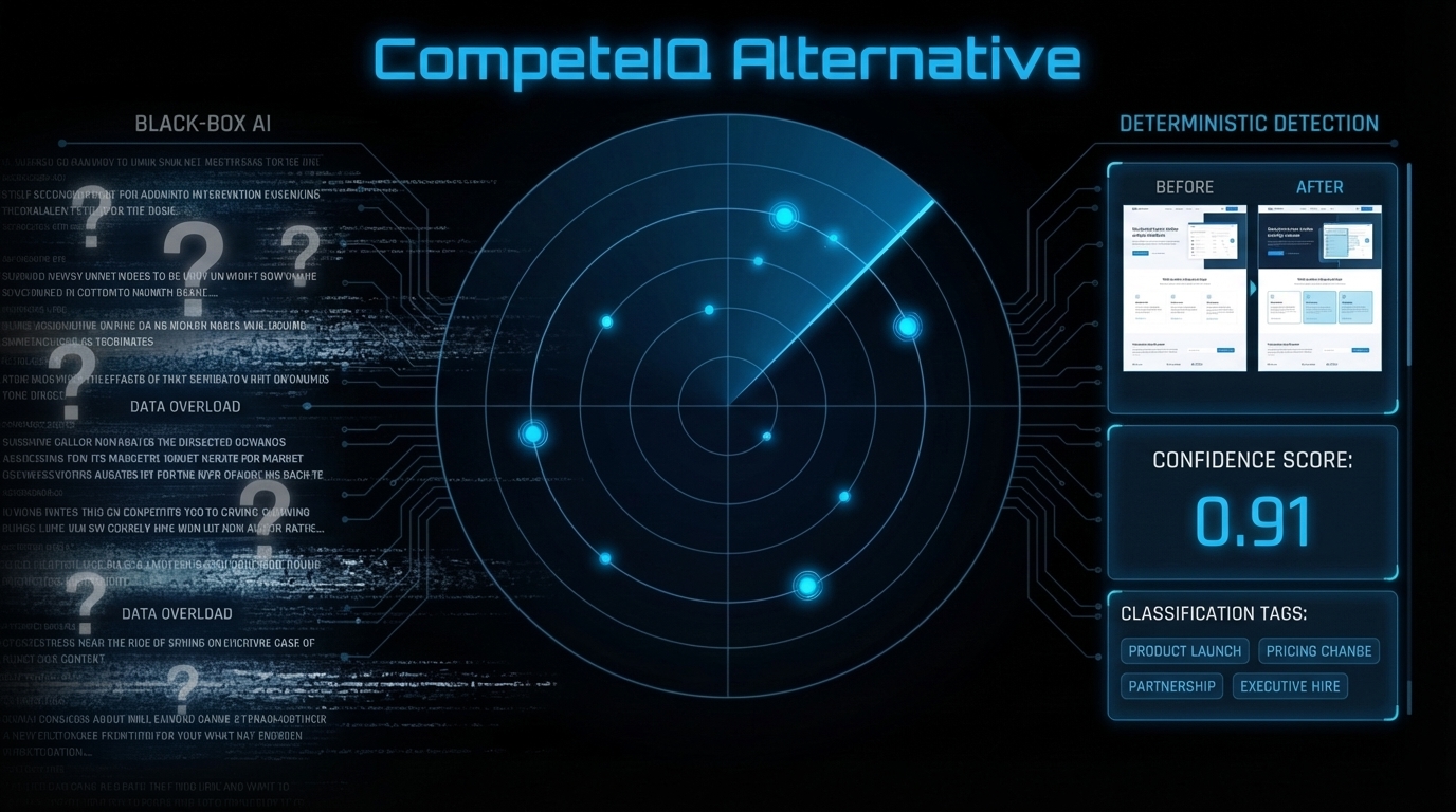 Quick Answer: CompeteIQ uses AI to classify and surface competitor signals. Metrivant uses deterministic detection — every signal is traceable to the exact page text that changed, with before/after evidence any team member can verify. Starting at $9/mo with zero AI inference between detection and output.